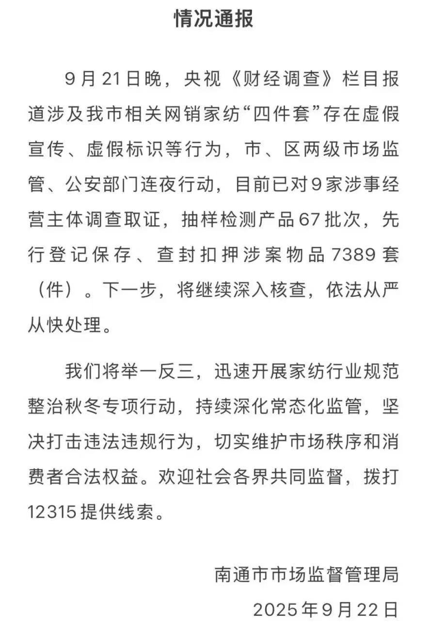 2025年9月21日晚,央视《财经调查》栏目一则深度报道,撕开了江苏南通、浙江嘉兴等地家纺市场的“遮羞布”。